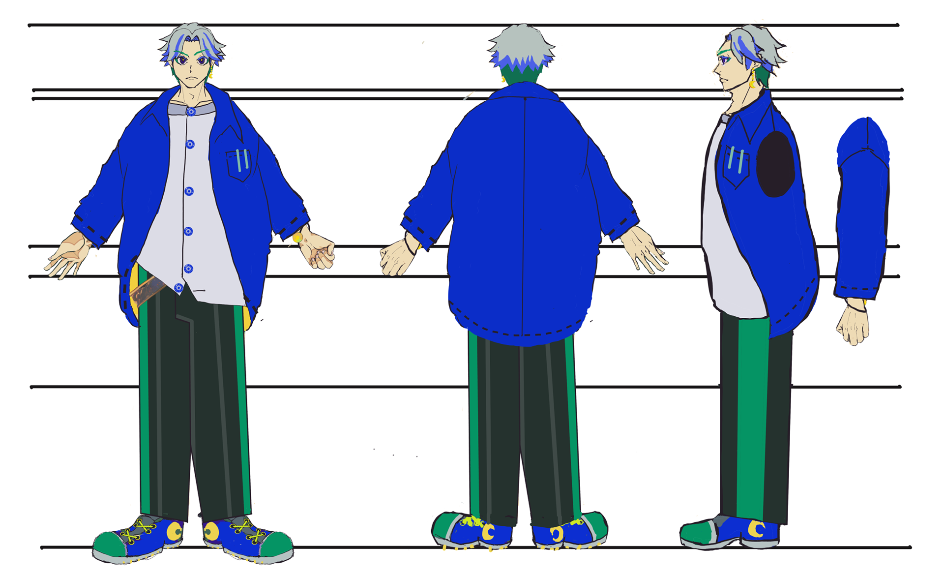 ●男性(青とヒアリングで得た服装のイメージ写真)